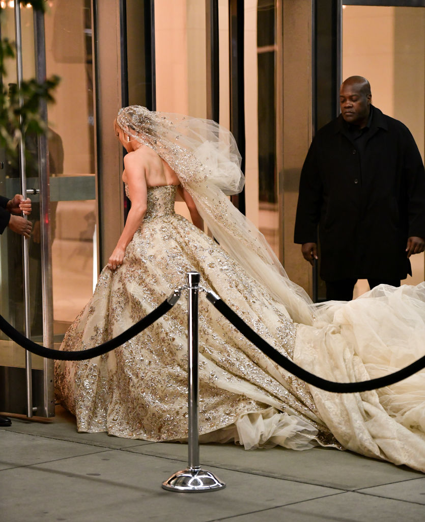 Но в фильме героиня Дженнифер – тоже знаменитая поп-звезда – выходит замуж с размахом в кутюрном бальном платье Zuhair Murad с длинным шлейфом и вуалью, обильно расшитыми кристаллами.