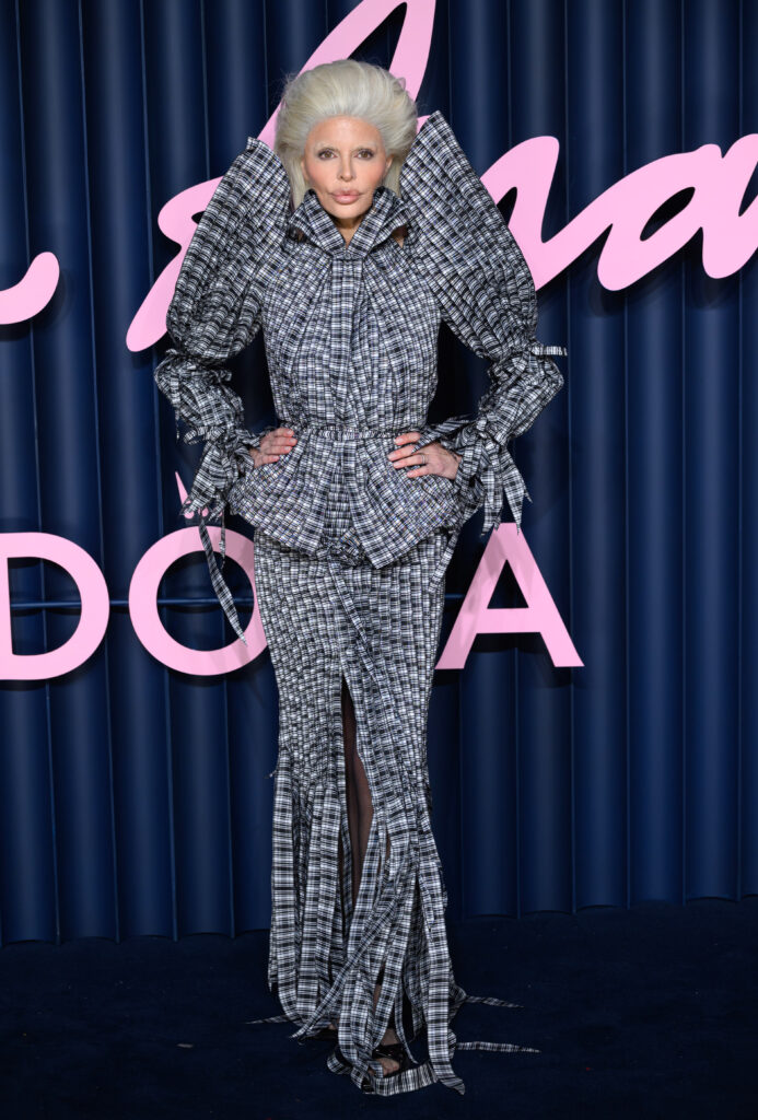 Не можна було оминути й Лізу Рінну, яка влаштувала власне міні-шоу: вибілене волосся з начосом, висвітлені брови, чорно-білий костюм у клітинку з масивними плечима і довгою бахромою. Це образ від британського дизайнера, який сам описав лук як «зустріч Лос-Анджелеса і Лондона» — драматично, гучно й з розрахунком на те, що саме ці фото розійдуться найбільше.