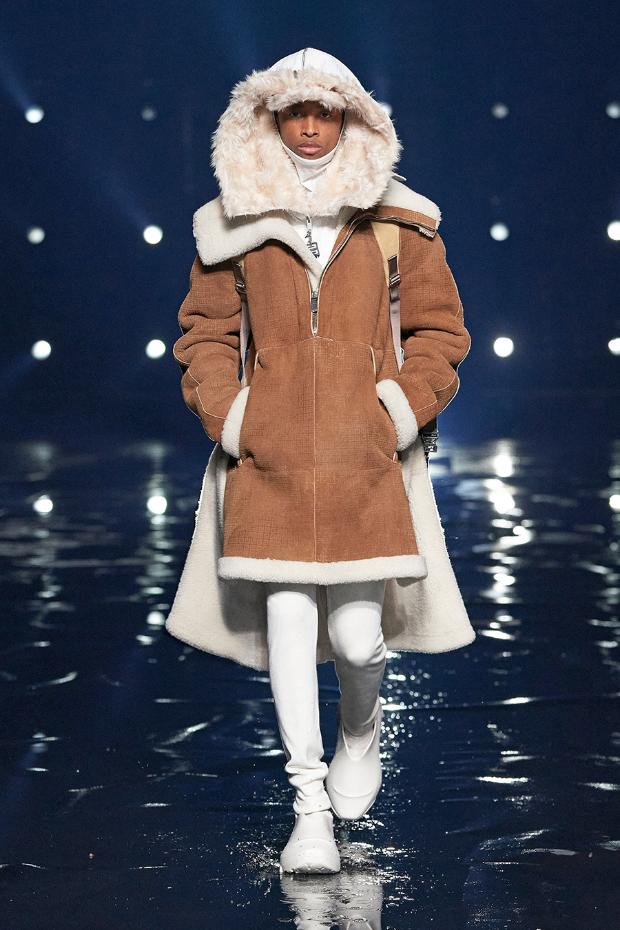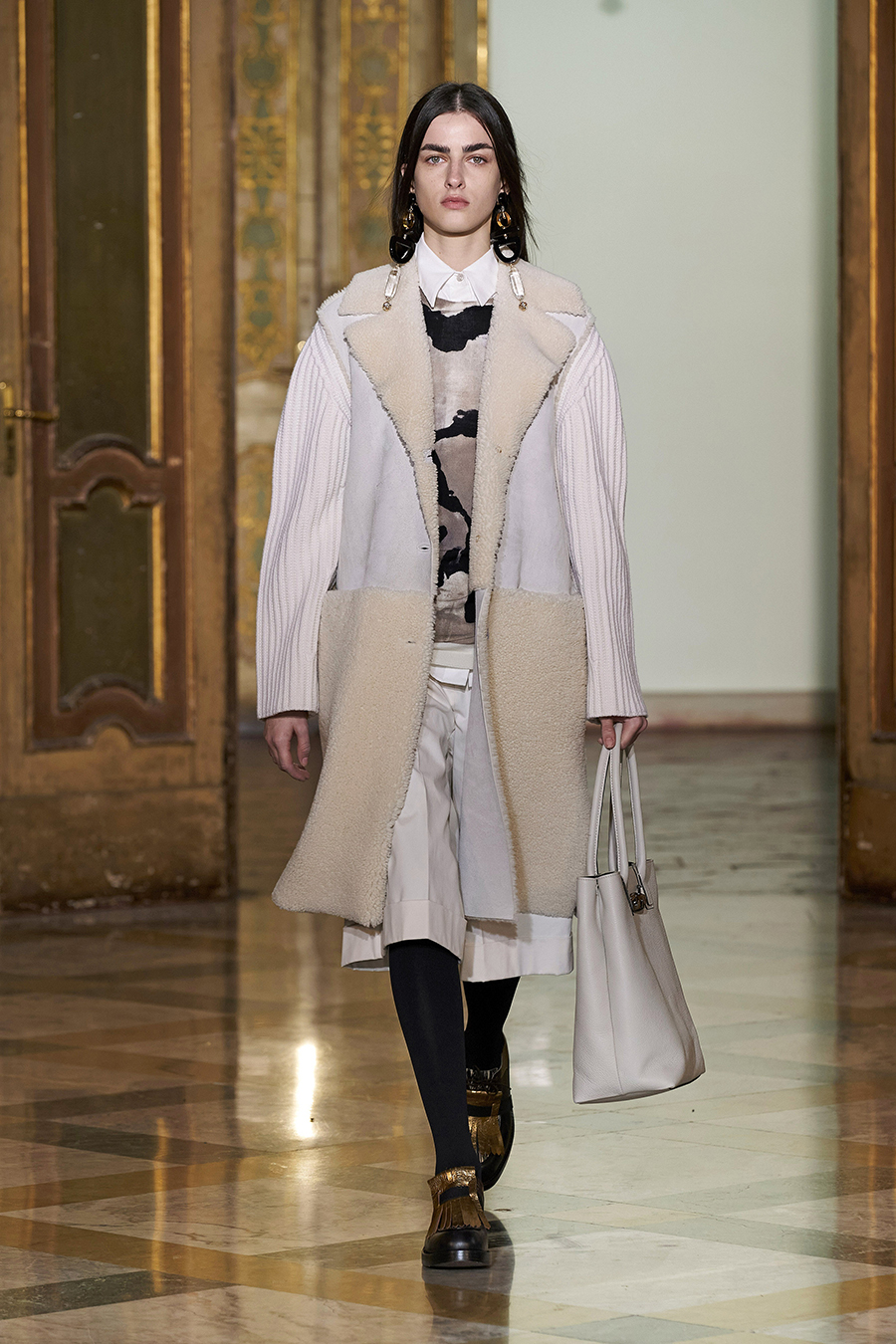 На показах осень-зима 2021-2022 было показано немало подобных дубленок – похожей длины и подлиннее, светлых, темных и черных.