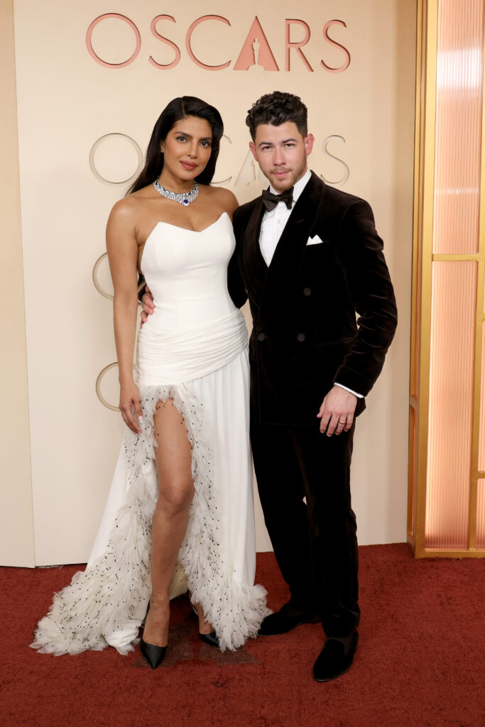 Приянка виглядала неймовірно в білій корсетній сукні з екстремально високим розрізом, декорованим пір’ям. Попри критику деяких фанатів щодо «важкої» стилізації, її діамантове кольє Bvlgari з блакитними акцентами стало однією з найдорожчих прикрас вечора.