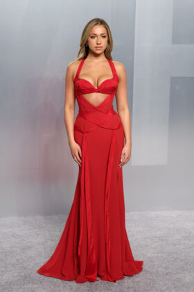 Лауреатка премії за найкращу жіночу роль обрала вбрання від Маттьє Блазі для Chanel. Сукня зі спущеними плечима у сміливому поєднанні червоного атласного верху та ніжно-рожевої спідниці стала омажем стилю Грейс Келлі, продемонструвавши бездоганну техніку колорблокінгу.