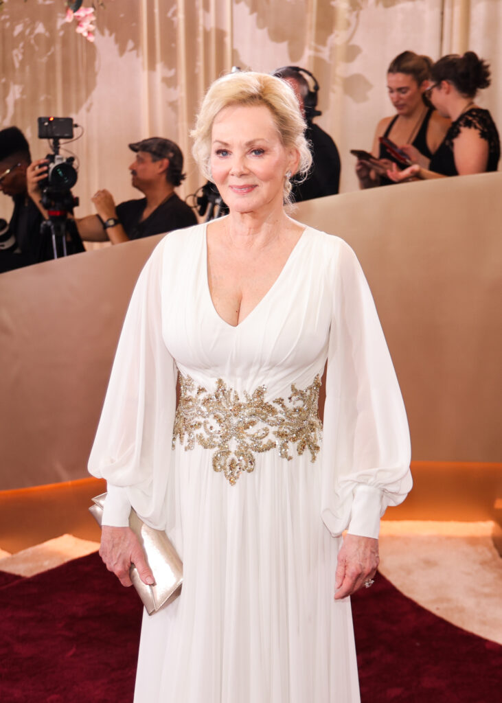 Джин Смарт прийшла у білому з золотим поясом і клатчем у тон — чистий приклад того, як мінімум елементів дає максимум ефекту.