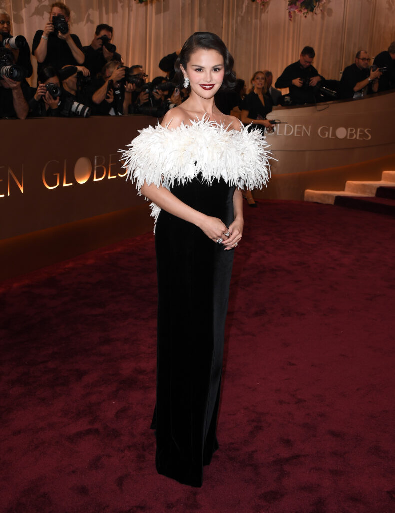 Селена Гомес обрала Chanel: маленька чорна сукня з акцентним пір’ям по лінії декольте — класика, яка не виглядає банально.