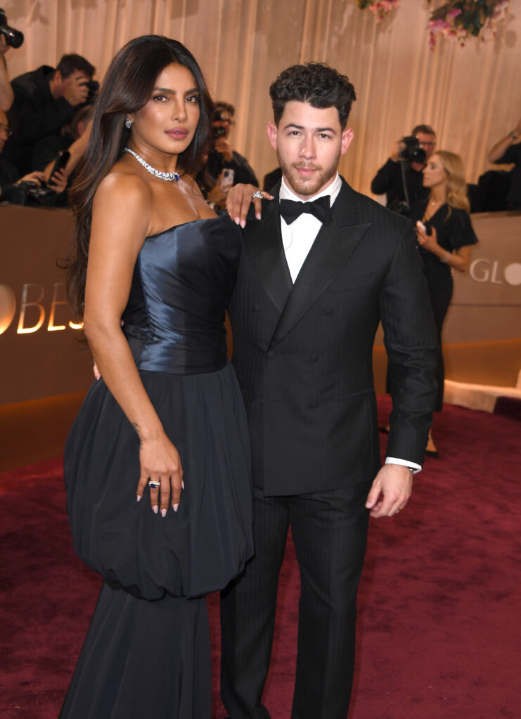 Пріянка Чопра зробила ставку на navy з об’ємною фактурою/силуетом і діамантовими прикрасами — хороший приклад, як “не чорне” може виглядати ще елегантніше.