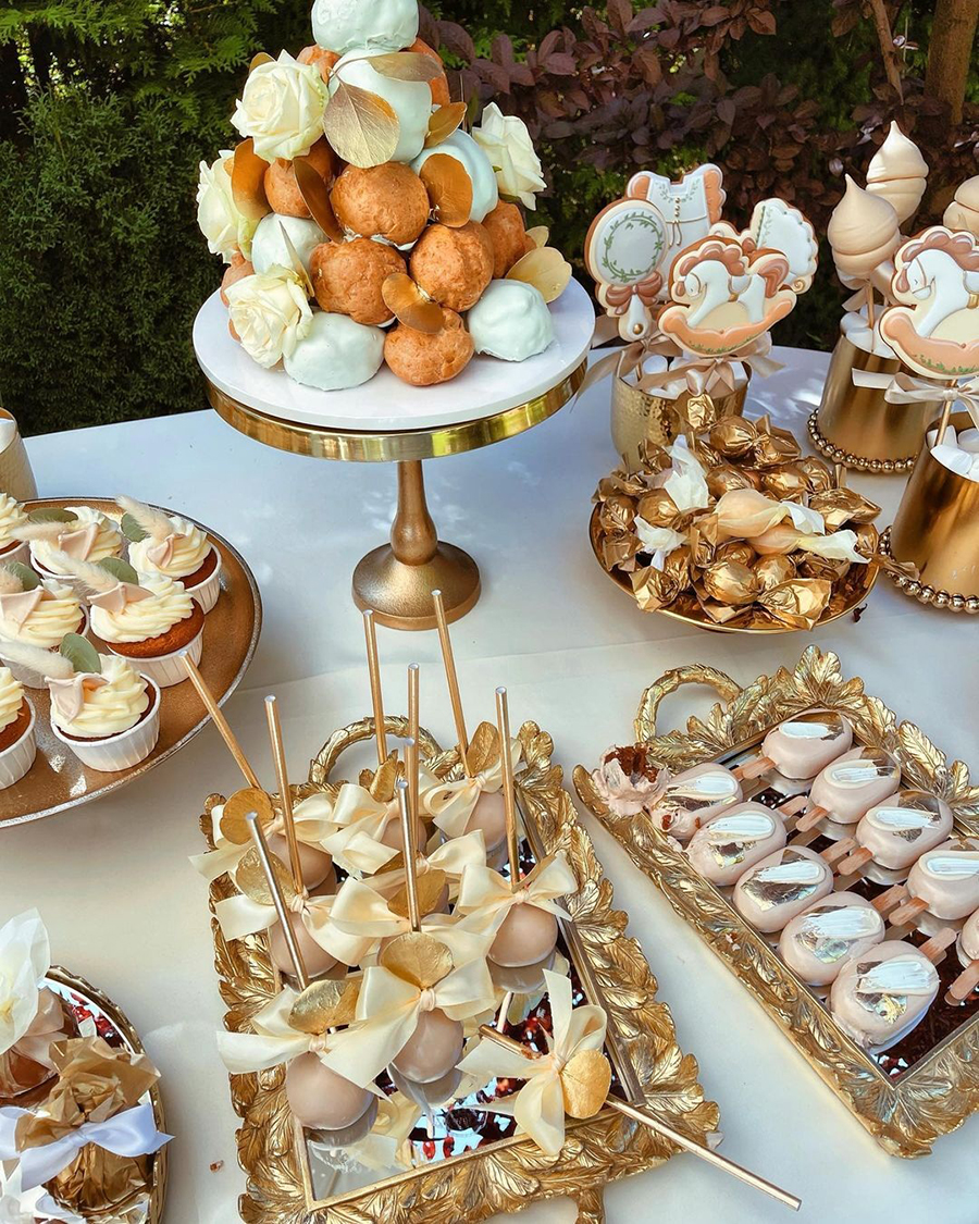 Прием для кумовей и светских подруг прошел в загородном доме Осадчей и Горбунова. Его оформили в модном нынешним летом стиле бохо. Основными цветами были золотой, бежевый, белый, приглушенный оранжевый и зеленый. Будущая мама была одета в платье-вышиванку с открытыми плечами и высоким разрезом от Юлии Магдыч.