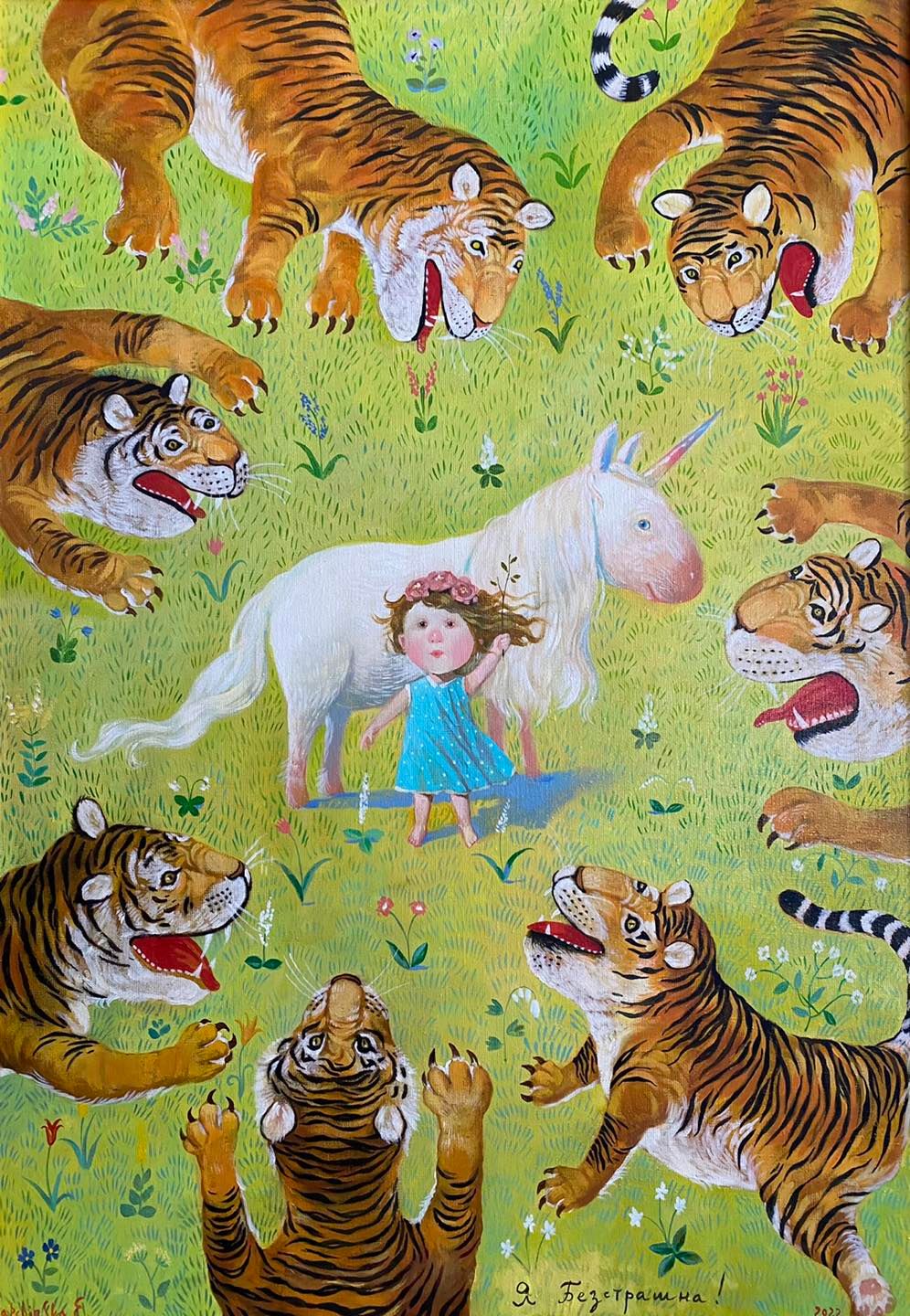 Ще до повномасштабного вторгнення Євгенія створила дивовижну картинку, на якій дівчинка з гілочкою захищає єдинорога від зграї тигрів. Зараз художниця називає цю роботу символічною та передчуттям подій.