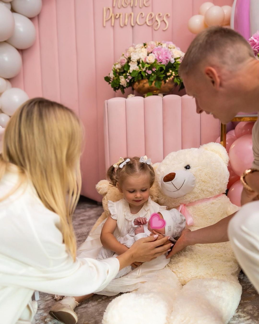 “Наше перше фото в новому складі, – тішиться молода мама. – Дякую усім за привітання та ваші теплі побажання”. І показує милу фотоісторію в рожевих тонах.