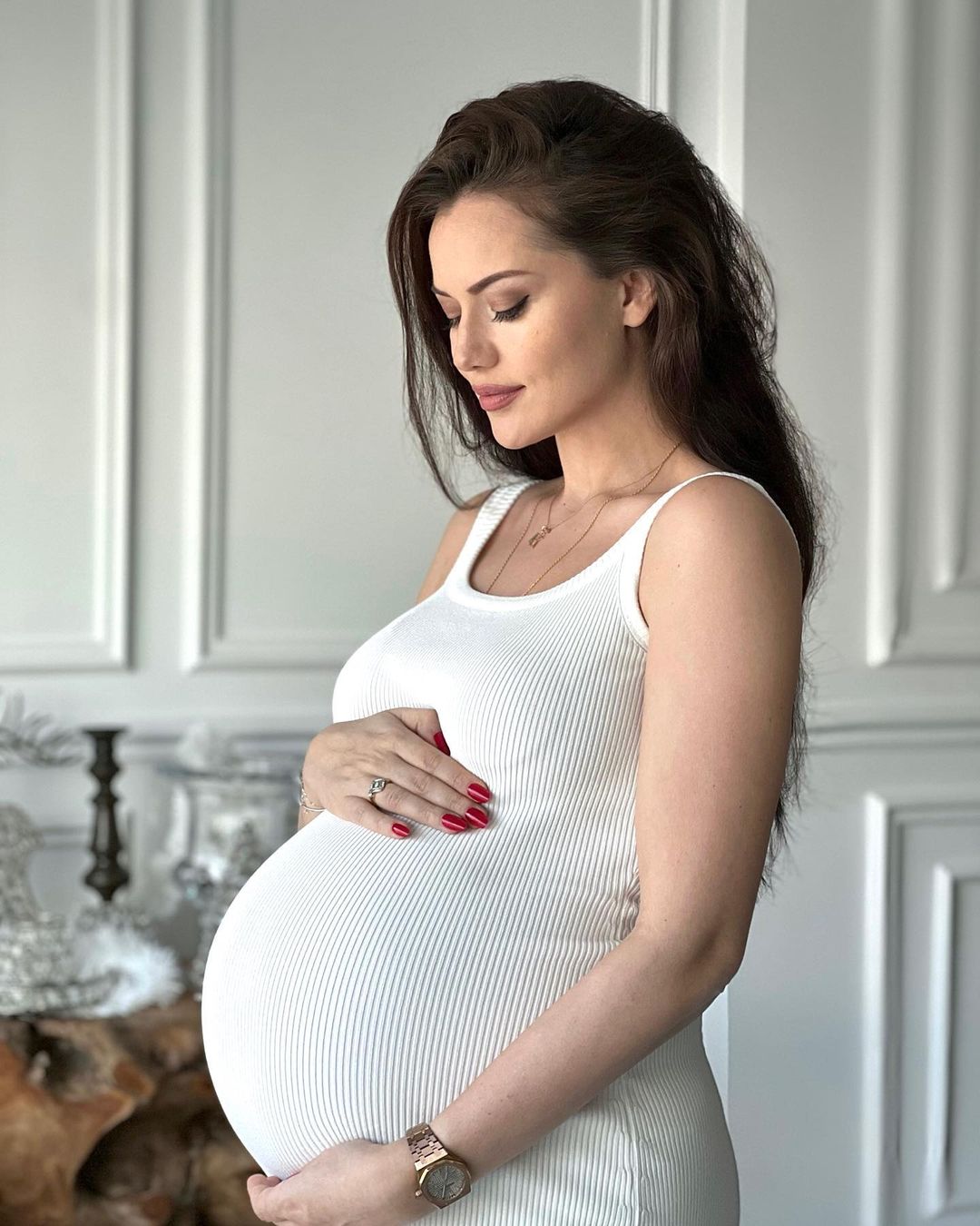 В сторіс обидва показували зміни у фігурі Евджен. Та вперше офіційне “вагітне” фото розмістили у соцмережах щойно. На ньому гарна і витончена Евджен у простій білій трикотажній сукні ніжно тримає великий живіт. “Ми скоро зустрінемось!” – підписала світлини Фахріє. “Чекаю!” – коментує Бурак Озчивіт.