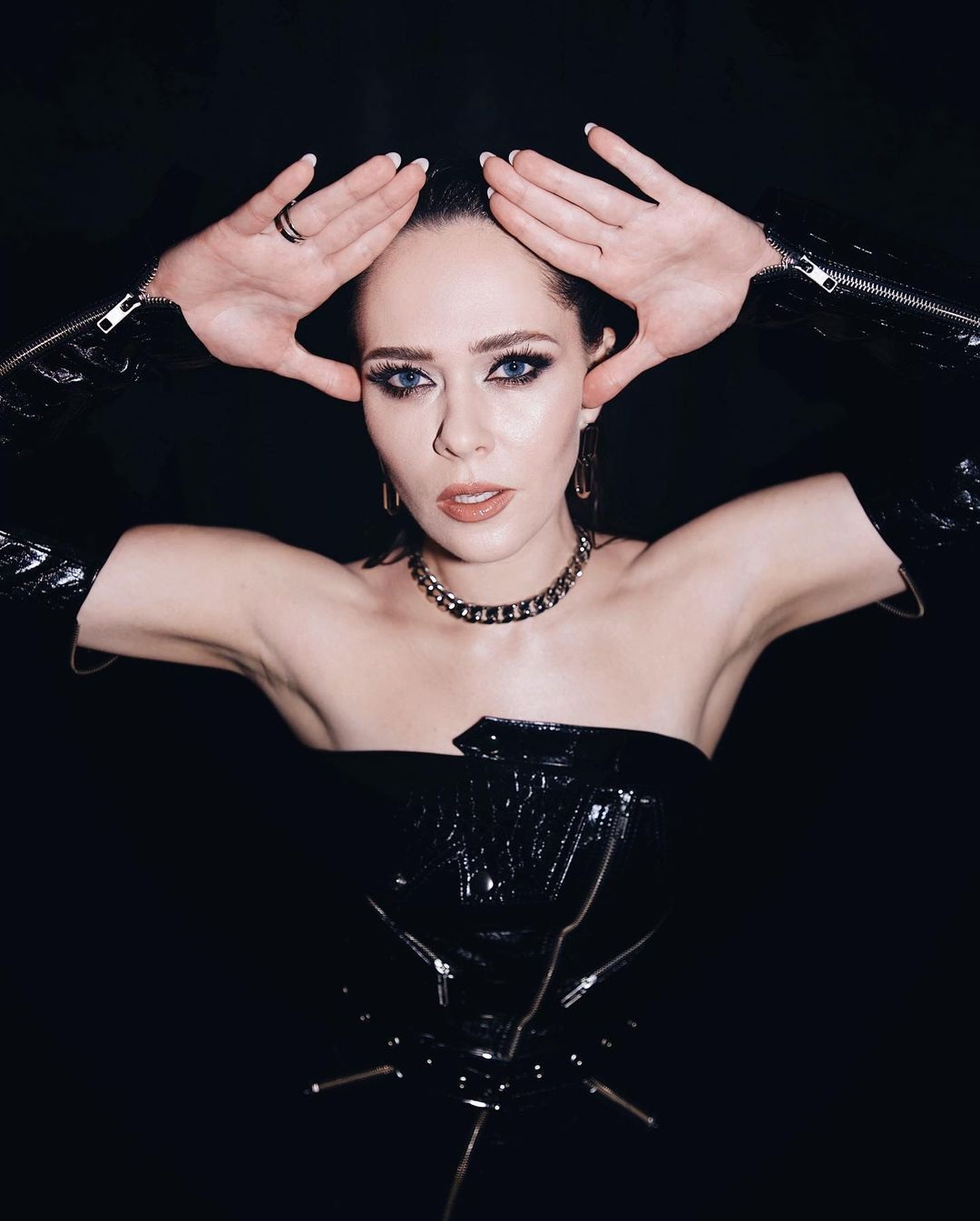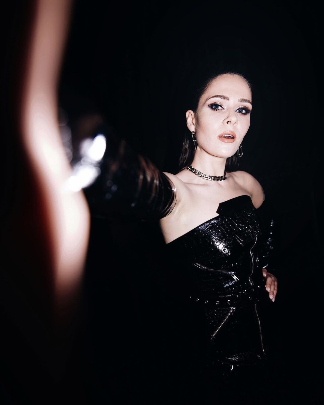 Костюм у вигляді шкіряного корсету та спідниці зі шкіри з тисенням і ефектними полум’яними вставками зробив український бренд GUDU. Він спеціалізується на чітко скроєних, з ідеальною посадкою і майстерною обробкою речах саме зі шкіри.
