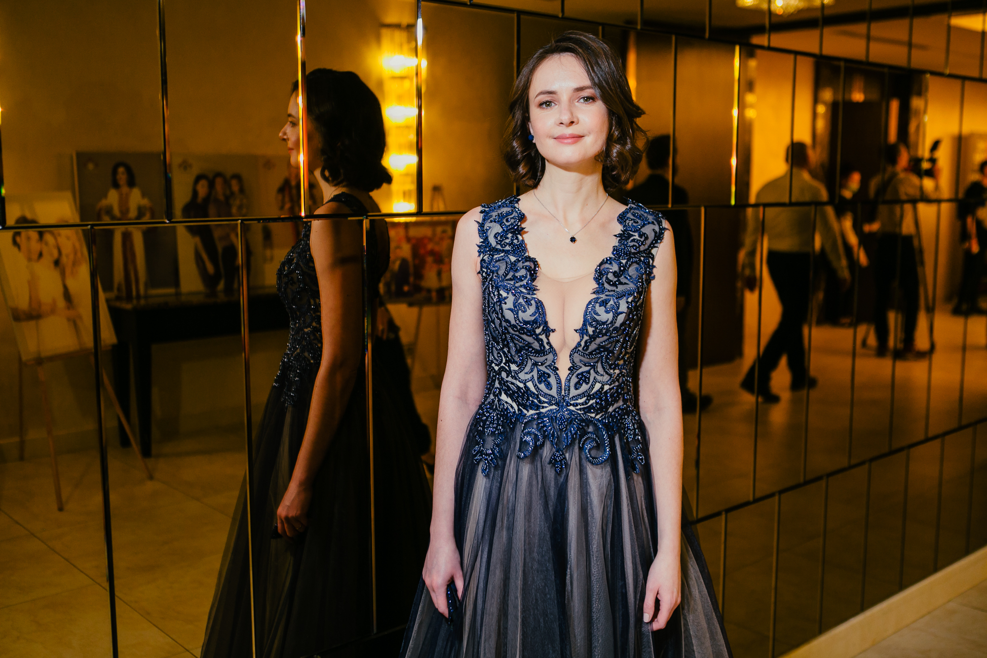 На торжественный вечер Свят пришел в строгом черном костюме и белой рубашке, образ уже традиционно дополнил яркими носками из своей коллекции — красного цвета с перцами в тон элегантной бабочки, а его жена появилась в длинной шифоновом платье синего цвета — легкие локоны и вечерний макияж завершили лук.