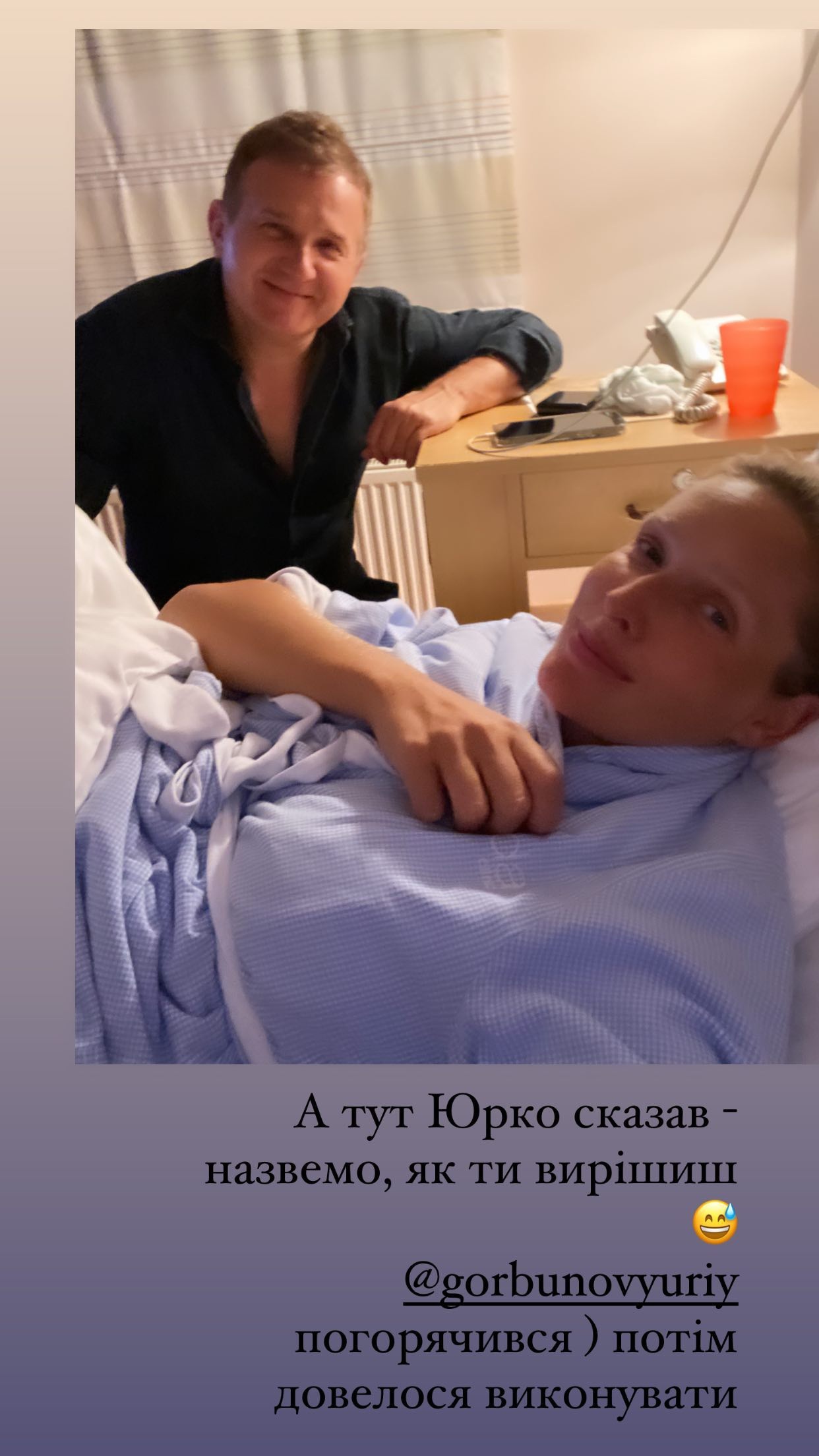 І ось я з Іваном на задньому сидінні везу себе в пологовий, адже в місті репетиція параду, Юрко на роботі і скорше доїду я, ніж хтось до мене. Тато в смокінгу і милі приїхав вже прямо в пологовий. І вже за п’ять годин ми тримали на руках ще одного Горбунова”.